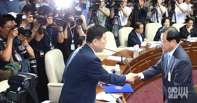 7일 서울 여의도 국회에서 열린 이병기 국정원장 후보자 인사청문회에서 김광림 국회 정보위원장이 청문회 직전, 이 후보자와 악수를 나누고 있다.
