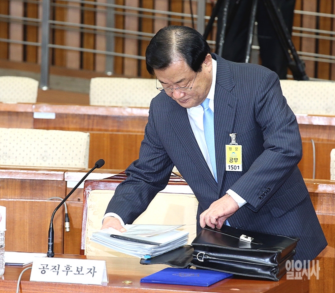 7일 서울 여의도 국회에서 열린 이병기 국정원장 후보자에 대한 인사청문회가 열린 가운데, 이 후보자가 정회 직후 서류들을 챙기고 있다.