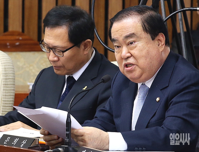 7일, 서울 여의도 국화에서 열린 이병기 국정원장 후보자에 대한 인사청문회에서 문희상 새정치민주연합 의원이 질의하고 있다.