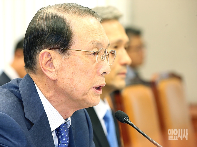7일, 김기춘 대통령 비서실장이 서울 여의도 국회에서 열린 운영위원회 전체회의에 출석해 의원들의 질의에 답변하고 있다.