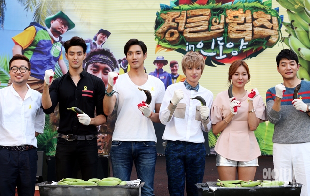 7일 서울 목동 SBS 야외 주차장에서 열린 SBS '정글의 법칙 in 인도양' 첫방송 기념 특별 이벤트에서 출연진들이 파이팅을 외치고 있다. 왼쪽부터 박휘순, 제임스, 강지섭, 니엘, 유이, 김승수.