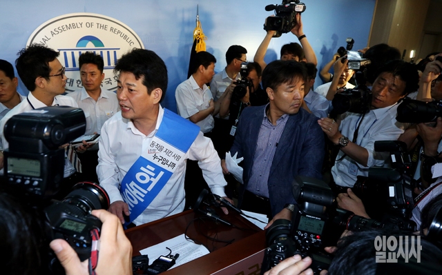 허동준 전 동작을 지역위원장이 8일 서울 여의도 국회 정론관에서 열린 기동민 전 서울시 정무부시장의 출마기자회견에 난입해 당 전략공천에 불만을 토로하고 있다.