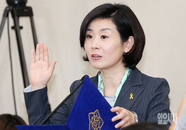 김희정 여성가족부 장관 후보자가 8일 서울 여의도 국회 여성가족위원회에서 열린 인사청문회에서 선서를 하고 있다.