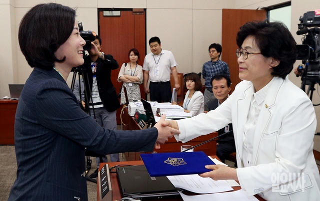김희정 여성가족부 장관 후보자(왼쪽)가 8일 서울 여의도 국회 여성가족위원회에서 열린 인사청문회에서 유승희 위원장에게 선서문을 제출한 뒤 악수하고 있다.