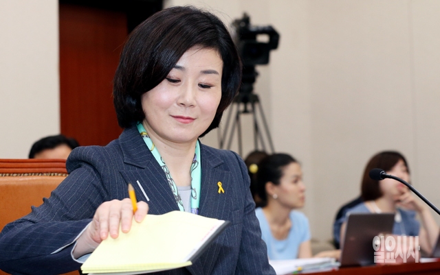 김희정 여성가족부 장관 후보자가 8일 서울 여의도 국회 여성가족위원회에서 열린 인사청문회에서 메모지를 챙기고 있다.