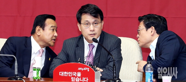 이완구 새누리당 원내대표(왼쪽)가 8일 서울 여의도 국회에서 열린 원내대책회의에서 정우택 의원과 대화하고 있다. 가운데는 윤상현 사무총장.