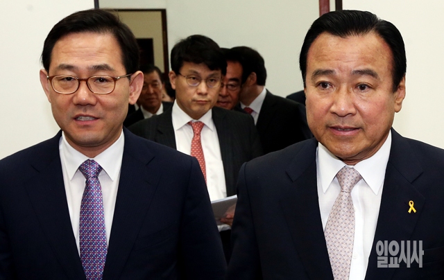이완구 새누리당 원내대표(오른쪽)와 주호영 정책위의장(왼쪽), 윤상현 사무총장이 9일 서울 여의도 국회에서 열린 비상대책위원회의에 참석하고 있다.