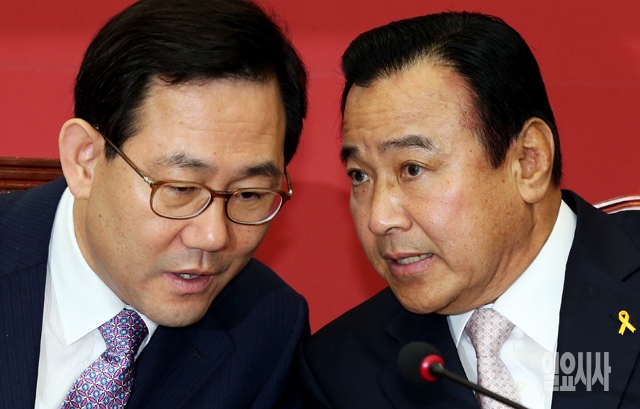이완구 새누리당 원내대표(오른쪽)와 주호영 정책위의장이 9일 서울 여의도 국회에서 열린 비상대책위원회의에서 대화하고 있다.