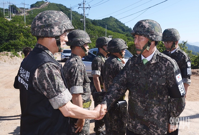 8일, 황진하 국회 국방위원장(사진 오른쪽)이 강원도 GOP 총기사고가 발생했던 22사를 방문·시찰해 관계자와 악수하고 있다. (사진공동취재단)