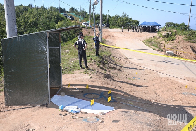 8일, 국회 국방위원회 위원들이 강원도 GOP 총기사고가 발생했던 22사를 방문·시찰한 가운데, 총기 난사 현장을 공개하고 있다. (사진공동취재단)