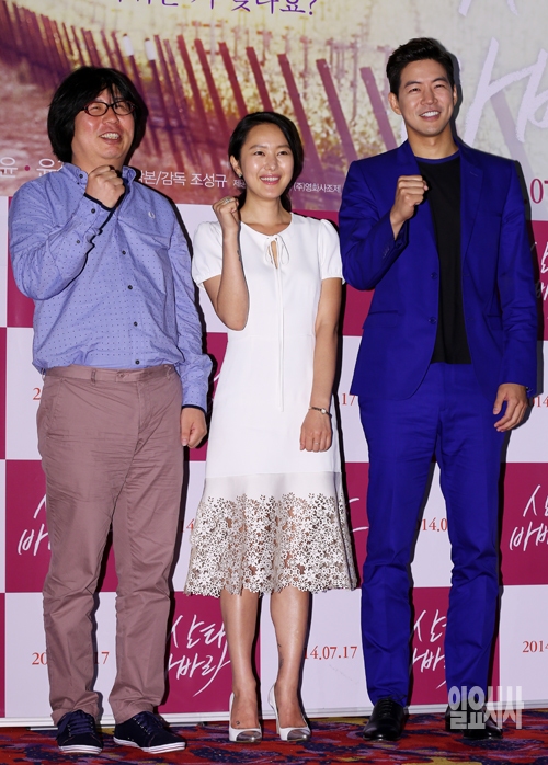 9일 서울 메가박스 코엑스점에서 열린 영화 '산타바바라' 언론시사회에서 감독 조성규(왼쪽부터), 배우 윤진서, 이상윤이 파이팅을 외치고 있다.