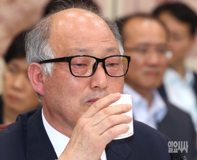9일, 서울 여의도 국회에서 열린 김명수 교육부장관 겸 사회부총리 후보자 인사청문회에서 김 후보자가 목이 타는 듯 물을 들이키고 있다.