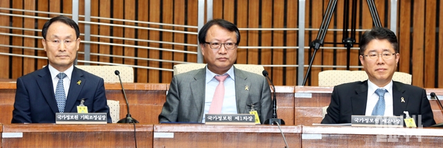 10일 서울 여의도 국회에서 열린 세월호침몰사고진상규명국정조사 특별위원회 전체회의에서 국가정보원 이한수 기획조정실장(왼쪽부터), 한기범 제1차장, 김수민 제2차장이 참석, 회의시작을 기다리고 있다.