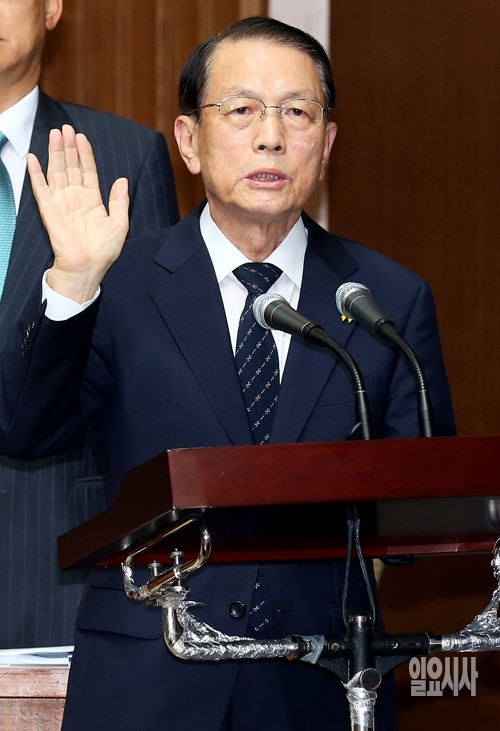 김기춘 청와대 대통령비서실장이 10일 서울 여의도 국회에서 세월호침몰사고진상규명국정조사 특별위원회 전체회의에서 증인선서를 하고 있다.