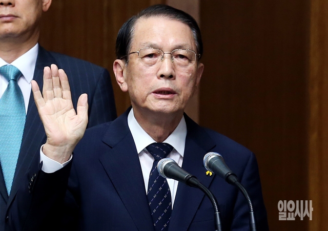 김기춘 청와대 대통령비서실장이 10일 서울 여의도 국회에서 세월호침몰사고진상규명국정조사 특별위원회 전체회의에서 증인선서를 하고 있다.