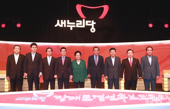10일, 서울 마포구 상암동 SBS프리즘타워 열린 새누리당 7.14 전당대회 후보자 2차 TV토론회 직전, 김무성·김태호·김영우·김상민·김을동·서청원·홍문종·이인제·박창달 후보(사진 왼쪽부터)가 손을 맞잡고 있다. (사진공동취재단)