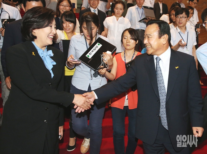 새누리당 이완구·새정치민주연합 박영선 원내대표가 10일, 서울 여의도 국회에서 박근혜 대통령과의 취임 첫 회동결과를 브리핑 후 헤어지기 직전, 악수를 나누고 있다.