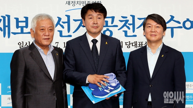 김한길(왼쪽), 안철수 새정치민주연합 공동대표와 기동민 서울 동작을 후보(가운데)가 11일 서울 여의도 국회에서 열린  7·30 재보궐선거 공천장 수여식에서 기념촬영을 하고 있다.