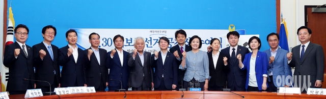 11일 서울 여의도 국회에서 열린  새정치민주연합 7·30 재보궐선거 공천장 수여식에서 당 지도부와 출마후보들이 파이팅을 외치고 있다. 왼쪽부터 박광온(경기 수원정), 한창희(충북 충주), 신정훈(전남 나주·화순), 이개호(전남 담양·함평·영광·장성), 조한기(충남 서산·태안), 김한길, 안철수 공동대표, 서갑원(전남 순천·곡성), 박영선 원내대표, 권은희(광주 광산을), 기동민(서울 동작을), 백혜련(경기 수원을), 정장선(경기 평택을), 김두관(경기 김포) 후보.