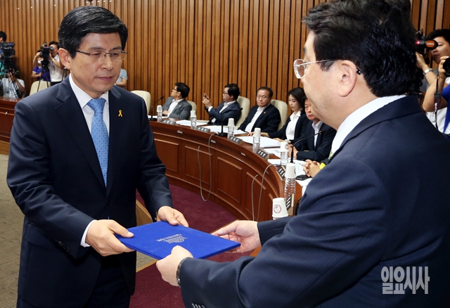 황교안 법무부 장관이 11일 서울 여의도 국회에서 열린 세월호침몰사고진상규명국정조사 특별위원회 전체회의에서 심재철 위원장에게 선서문을 제출하고 있다.