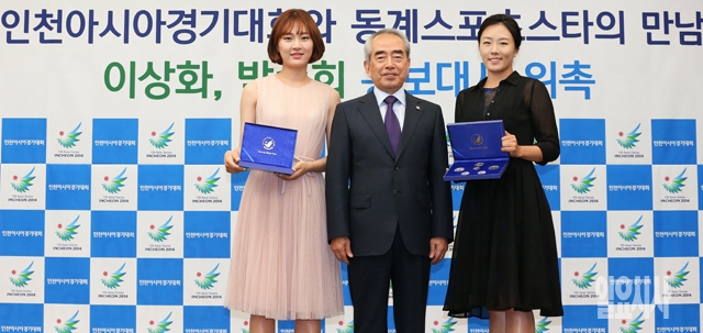 스피드스케이팅 이상화 선수(오른쪽)와 쇼트트랙 박승희 선수(왼쪽)가 14일 서울 중구 프레스센터에서 열린 2014인천아시아경기대회 홍보대사 위촉식에서 김영수 조직위원장으로부터 기념주화를 받은 뒤 기념촬영을 하고 있다.