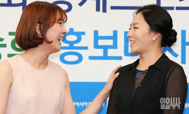 스피드스케이팅 이상화 선수(오른쪽)와 쇼트트택 박승희 선수가 14일 서울 중구 프레스센터에서 열린 2014인천아시아경기대회 홍보대사 위촉식에서 대화하고 있다.