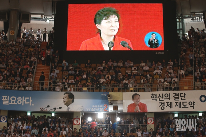 박근혜 대통령이 14일 오후, 서울 송파구 잠실실내체육관에서 열린 새누리당 7·14전당대회에 연설을 하고 있다.