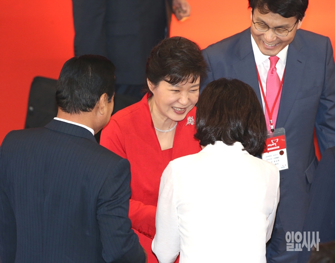 박근혜 대통령이 14일 오후, 서울 송파구 잠실실내체육관에서 열린 새누리당 7·14전당대회에 축사 후 나경원 전 새누리당 의원과 악수하고 있다.