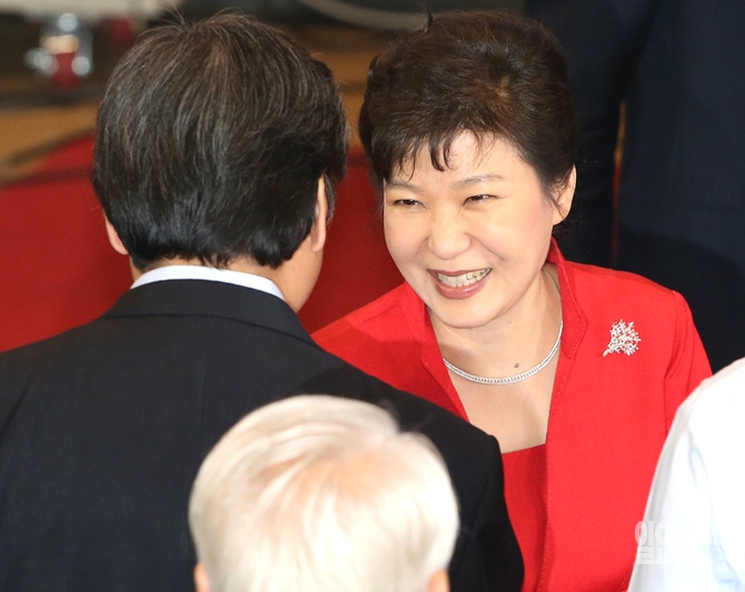 박근혜 대통령이 14일 오후, 서울 송파구 잠실실내체육관에서 열린 새누리당 7·14전당대회에서 김무성 의원과 악수를 하고 있다.