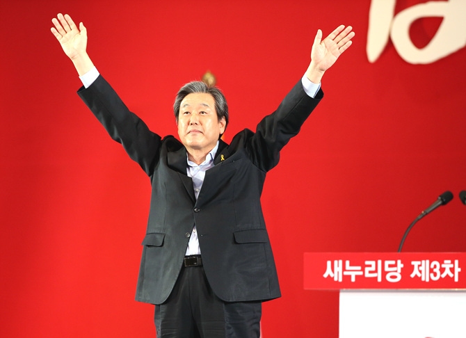 새누리당 김무성-서청원 의원이 14일 오후, 서울 송파구 잠실실내체육관에서 열린 새누리당 7·14전당대회에서 팔을 번쩍 들고 지지를 호소하고 있다.
