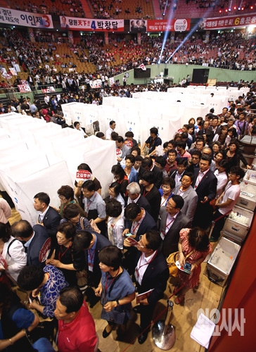 14일 오후, 서울 송파구 잠실실내체육관에서 새누리당 7·14전당대회가 열린 가운데, 당원들이 입장하고 있다.