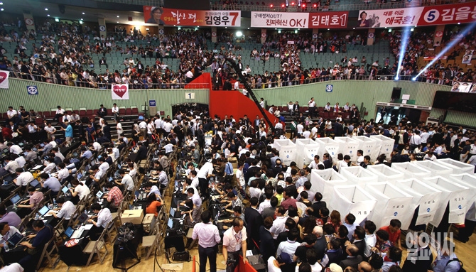 14일 오후, 서울 송파구 잠실실내체육관에서 새누리당 7·14전당대회가 열리고 있는 가운데, 취재진의 취재 열기 또한 뜨겁다.
