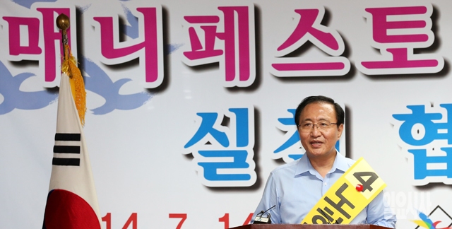 정의당 노회찬 동작을 후보가 14일 서울 동작구 선거관리위원회에서 열린 매니페스토 정책선거 실천 협약식에서 인사말을 하고 있다.