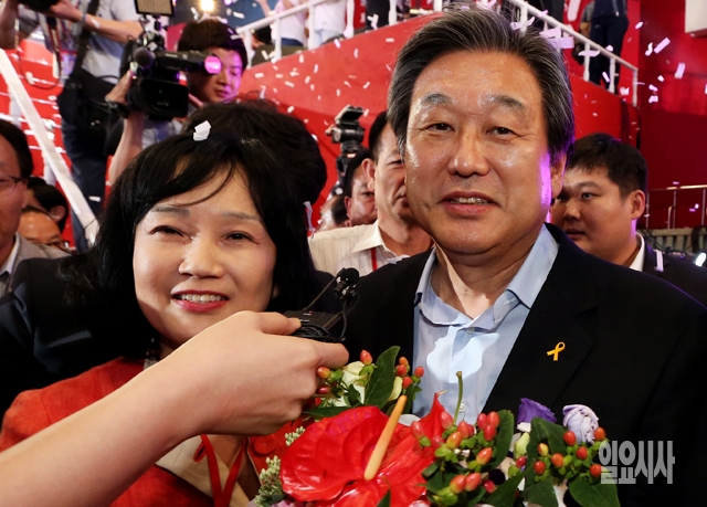14일 서울 송파구 잠실실내체육관에서 열린 새누리당 대표최고위원 및 최고위원 선출을 위한 전당대회에서 당대표로 선출된 김무성 의원이 부인 최양옥 씨와 대회장을 나서고 있다.