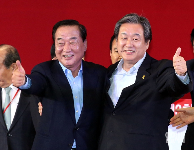 14일 오후, 서울 송파구 잠실실내체육관에서 열린 새누리당 7·14 전당대회에서 김무성 후보(사진 오른쪽)가 신임 대표로 선출됐다. 기대를 모았던 서청원 의원은 큰 표 차이로 2위를 차지해 이인제, 김태호, 김을동 등과 함께 최고위원 자리에 올랐다.
