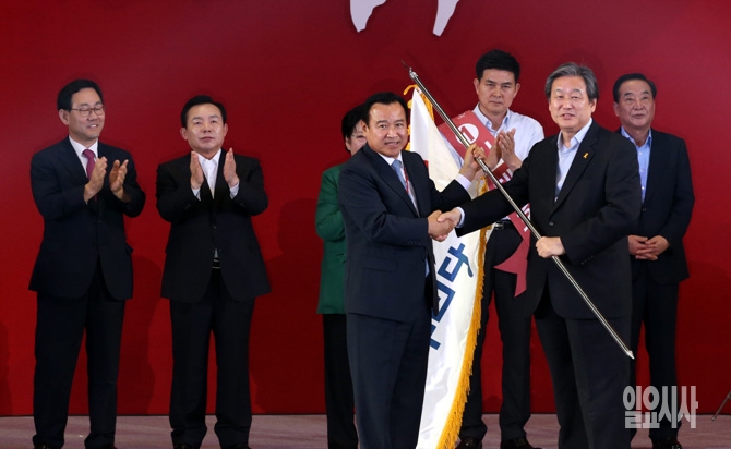 14일 오후, 서울 송파구 잠실실내체육관에서 열린 새누리당 7·14 전당대회에서 김무성 후보가 신임 대표로 선출된 직후 이완구 원내대표 겸 비대위원장으로부터 당기를 받아들고 있다.