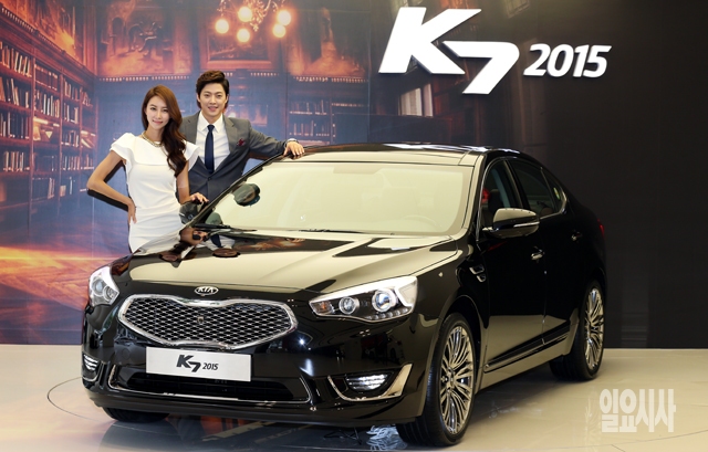 기아자동차가 15일 서울 강남구 압구정동 기아차 국내영업본부에서 프리미엄 준대형 세단 'K7 2015'를 선보이고 있다.