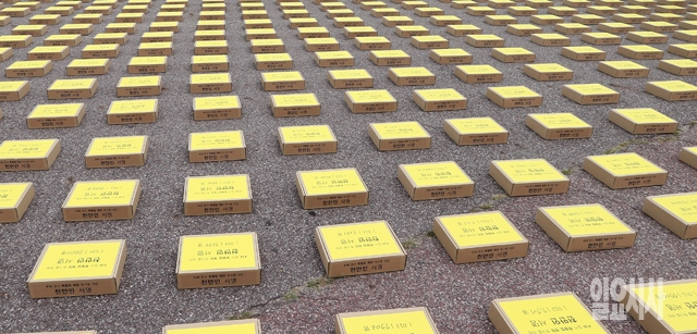 세월호 참사 국민대책회의가 15일 서울 여의도공원에서 기자회견을 갖고 있는 가운데 4·16 특별법 제정을 촉구하는 시민350만1266명의 서명이 담긴 416개의 박스가 바닥에 놓여 있다.