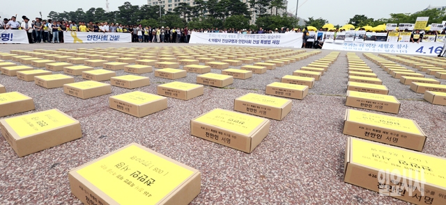 세월호 참사 국민대책회의가 15일 서울 여의도공원에서 기자회견을 갖고 있는 가운데 4·16 특별법 제정을 촉구하는 시민350만1266명의 서명이 담긴 416개의 박스가 바닥에 놓여 있다.