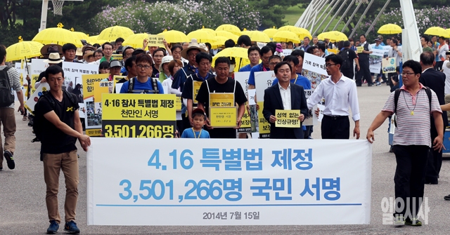 세월호 참사 국민대책회의가 15일 서울 여의도공원에서 기자회견을 마친 뒤 4·16 특별법 제정을 촉구하는 시민350만1266명의 서명이 담긴 박스를 들고 국회로 향하고 있다.