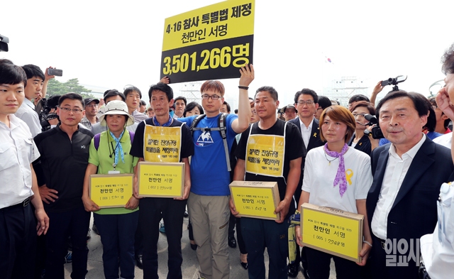 세월호 참사 국민대책회의가 15일 서울 여의도공원에서 기자회견을 마친 뒤 4·16 특별법 제정을 촉구하는 시민350만1266명의 서명이 담긴 박스를 들고 국회로 향하고 있다.