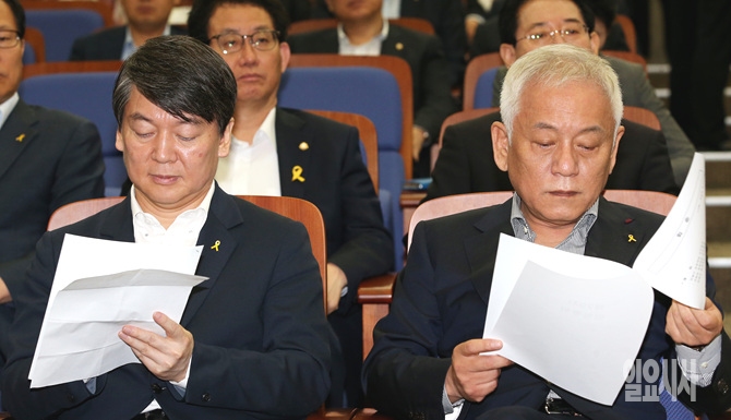 15일, 새정치민주연합 김한길·안철수 공동대표가 서울 여의도 국회에서 열린 의원총회에서 발언문을 확인하고 있다.