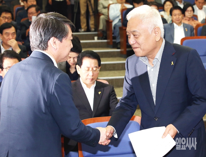 김한길-안철수 새정치민주연합 공동대표가 15일, 서울 여의도 국회 의원총회에서 악수하고 있다.