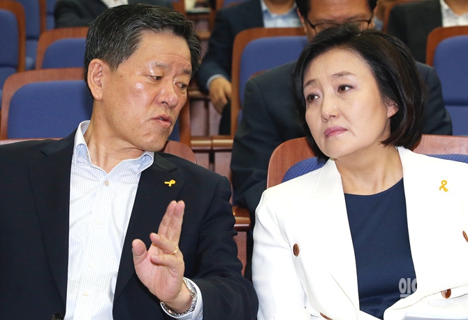박영선 새정치민주연합 원내대표가 15일, 서울 여의도 국회 의원총회에서 주승용 사무총장과 이야기를 나누고 있다.