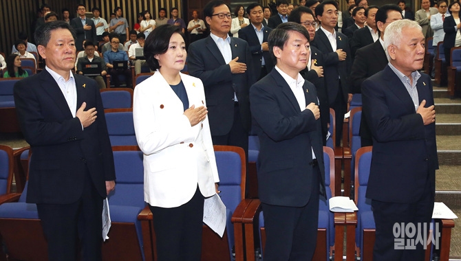김한길·안철수 새정치민주연합 공동대표 등 지도부가 15일, 서울 여의도 국회 의원총회 직전, 국기에 대한 경례를 하고 있다.