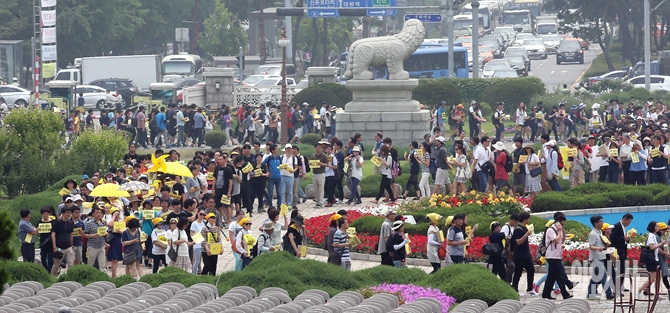 15일, 서울 여의도 국회에서 4·16 특별법 제정을 촉구하는 시민350만1266명의 서명이 담긴 416개의 박스를 국회에 전달하기 위해 세월호 참사 국민대책회의 일행이 국회 안으로 들어서고 있다.