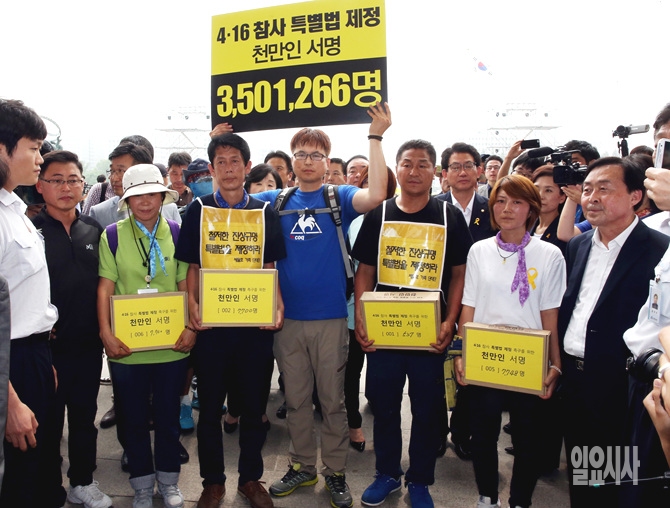 15일, 서울 여의도 국회에서 4·16 특별법 제정을 촉구하는 시민350만1266명의 서명이 담긴 416개의 박스를 국회에 전달하기 위해 세월호 참사 국민대책회의 일행이 피켓을 들고 있다.