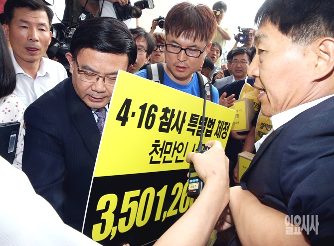 15일, 서울 여의도 국회에서 4·16 특별법 제정을 촉구하는 시민 350만1266명의 서명이 담긴 416개의 박스를 국회에 전달하기 위해 세월호 참사 국민대책회의 일행이 국회 안으로 들어서고 있다.