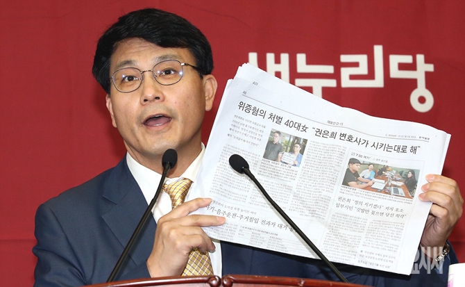 15일, 서울 여의도 국회에서 열린 새누리당 의원총회에서 윤상현 사무총장이 권은희 후보와 관련해 발언하고 있다.