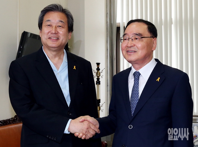 정홍원(오른쪽) 국무총리가 16일 서울 여의도 국회를 방문해 새누리당 김무성 대표를 만나 인사를 나누고 있다.